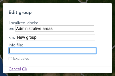 Groups can contain contexts or other groups. In the image above, for example, there’s a main group (Layers) that contains the Base layers group, which in turns contains the Blue Marble context (which contains the blue_marble wms layer). You can build a tree structure of groups and contexts to organize your maps in categories and subcategories.